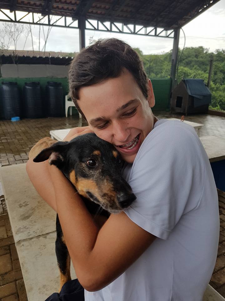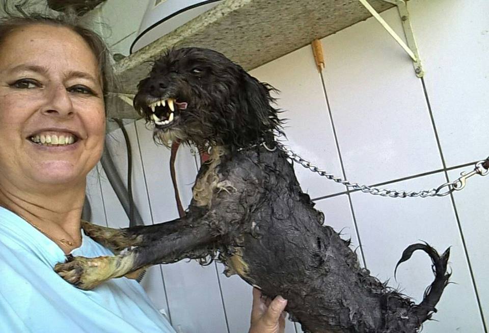 Bartolomeu, um dos cães do abrigo em dia de banho, dado pela Jussara, uma das voluntárias do abrigo.
